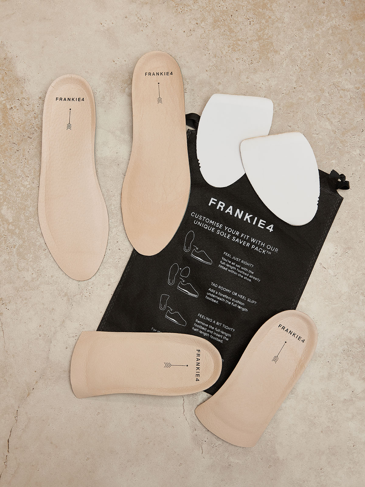 Piece together your perfectly tailored fit with our Sole Saver Pack®. The genius components found in your newly purchased shoes (two full-length footbeds, two half-length footbeds and two forefoot cushions to be exact) and complementary bag that come in every box of boots, sneakers and most flats for you to mix‑and-match according to your needs. We created this pack because no two feet are the same—narrow, wide, bunioned or not—we want to help FRANKIE4 shoes fit every unique foot like a glove.