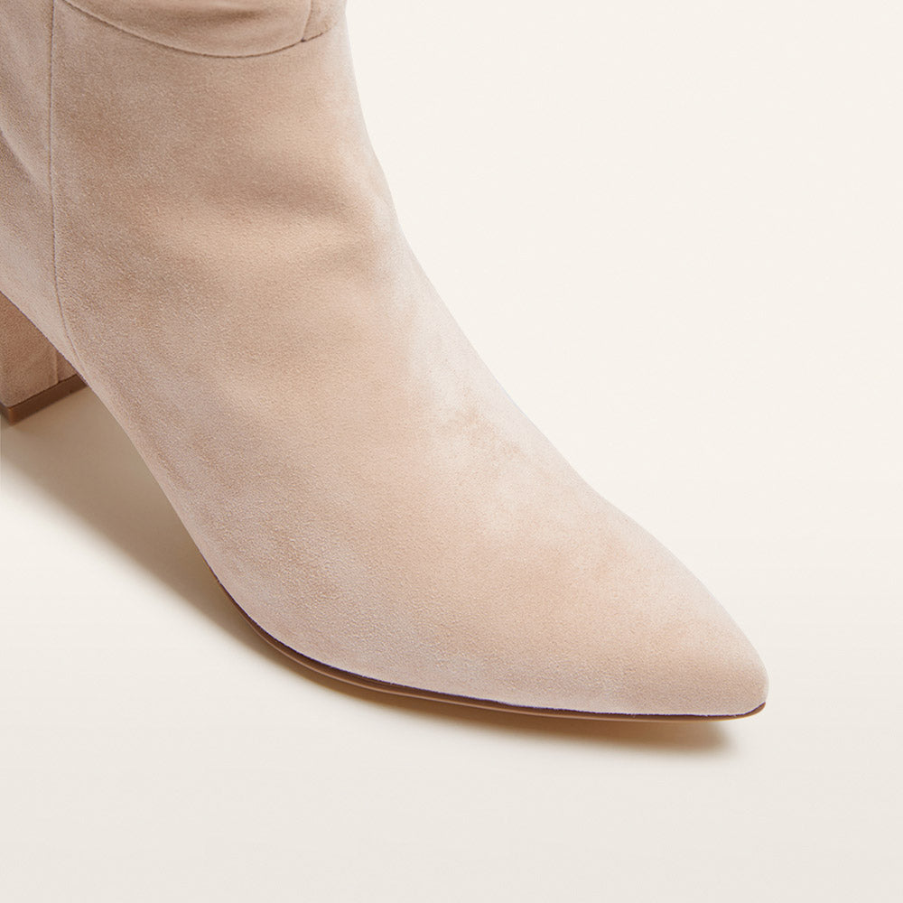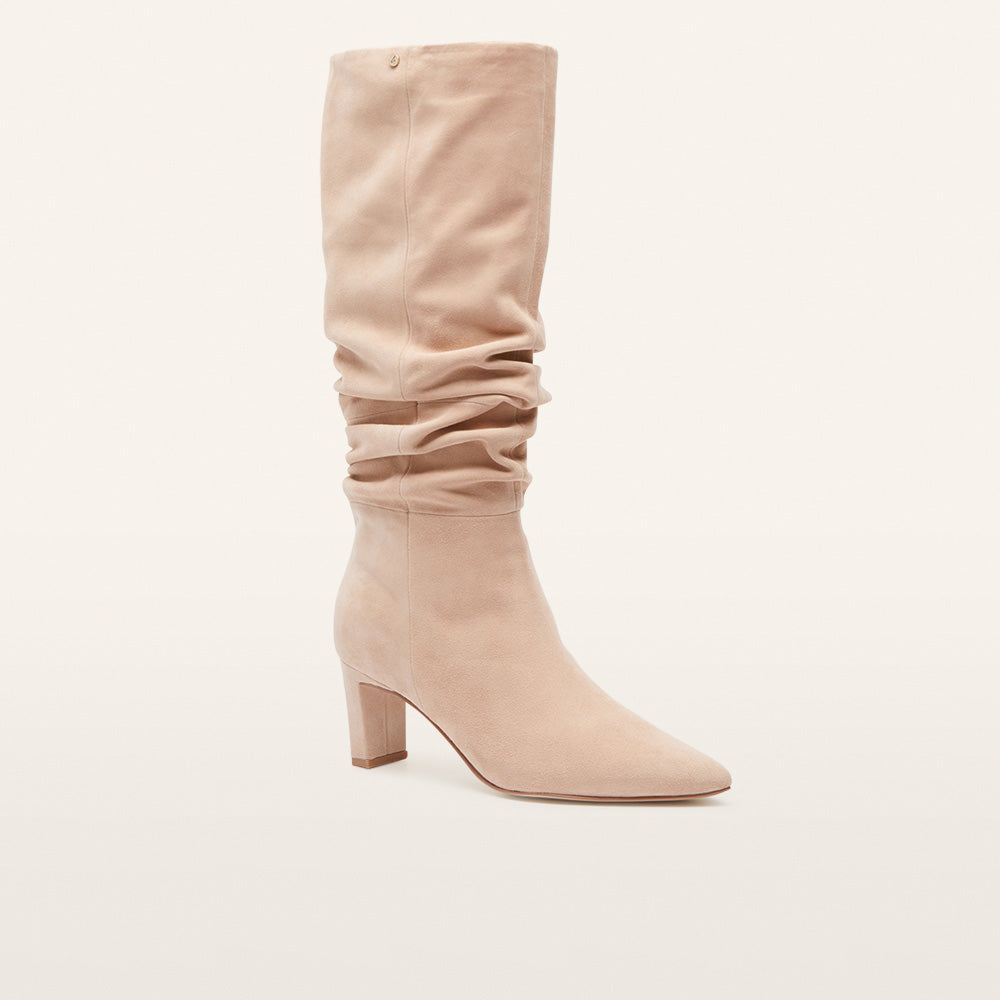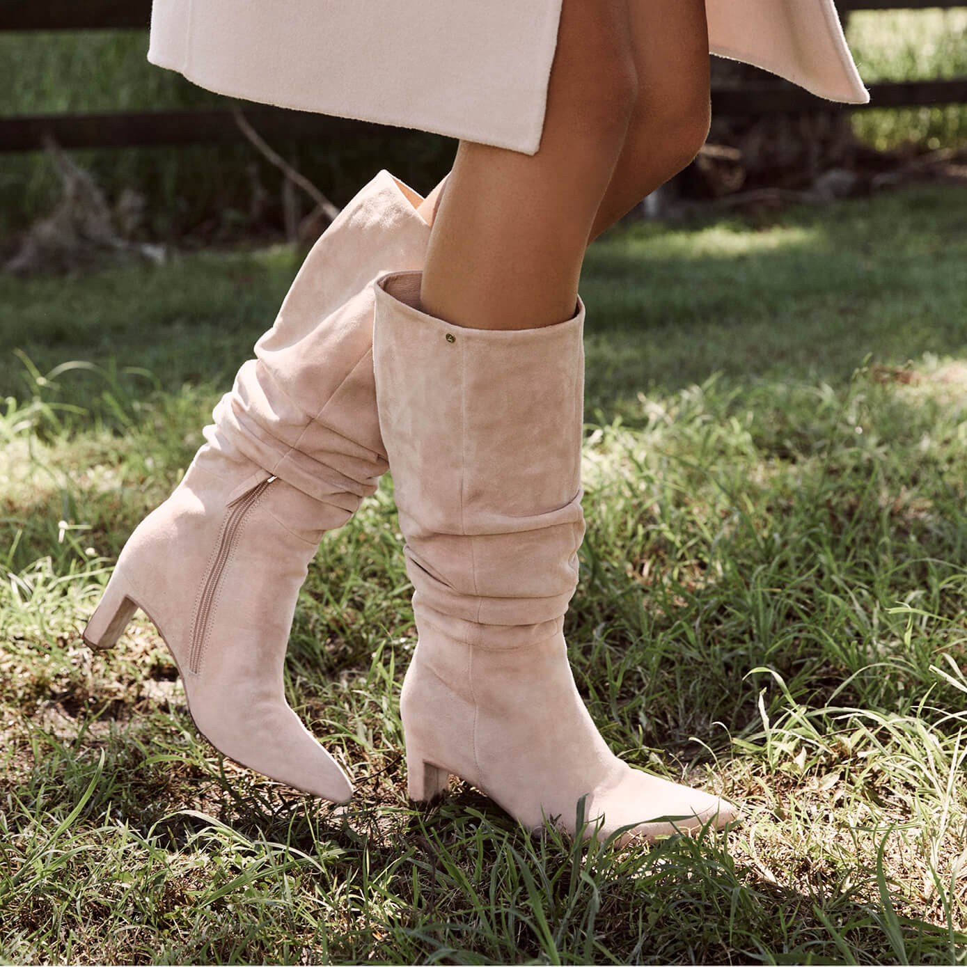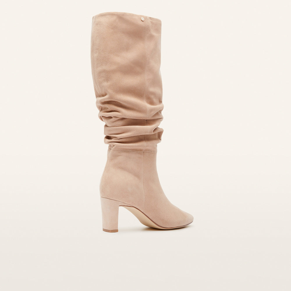 Instantly elevate any look with neutral knee-high AVA Sandshell—the silk-soft goat suede boot set atop a height-of-comfort high heel. Versatility at its best, this trans-seasonal style can be pushed down for a slouchier silhouette and teams well with denim to midi dresses.
