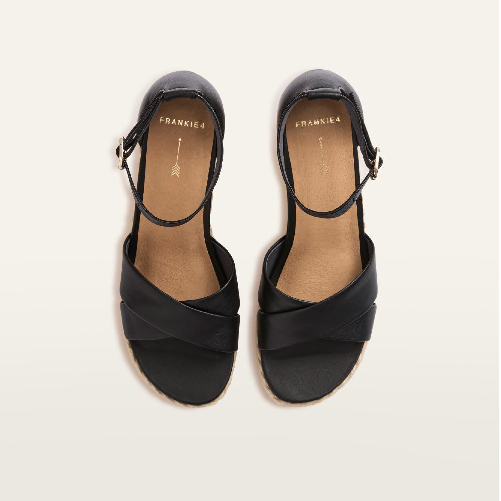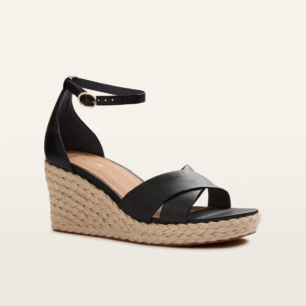 Taking warm-weather style to the heights of fashion, without any pitfalls —Baker in essential Black. Equipped with a triple-layer support and cushion system and our innovative footbed technology, Baker delivers a stepped-up silhouette and next-level comfort. Finished with quality leather, a classic espadrille jute wrap detail, adjustable ankle straps, and a flattering criss-cross design.