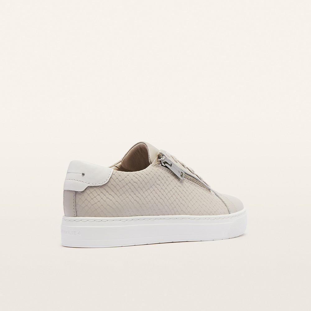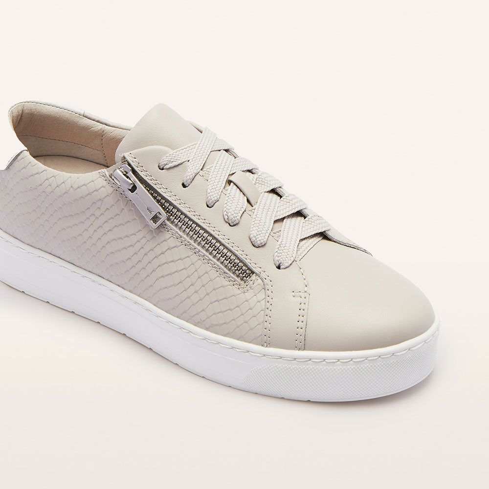 Modern, must-have, made to move: introducing Billie II in neutral Bone Grey Emboss. This sleek sneaker features a side zip for easy on and off wear, plush foam lining, and a four layer cushion and support system. Embossed leather adds an elevated touch, while our podiatrist-designed footbed and custom fit options deliver superior comfort. Billie stands out with luxe finishes and forward-thinking design.
