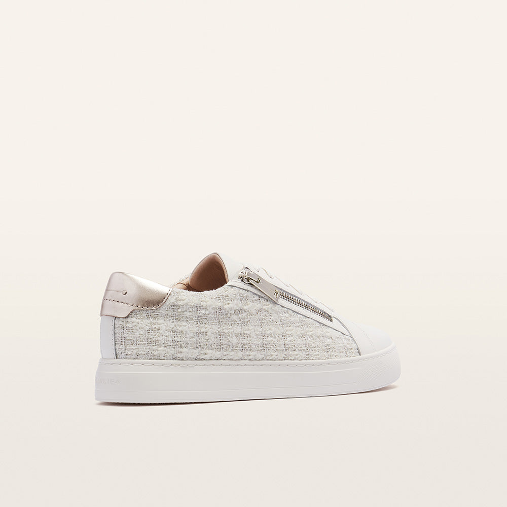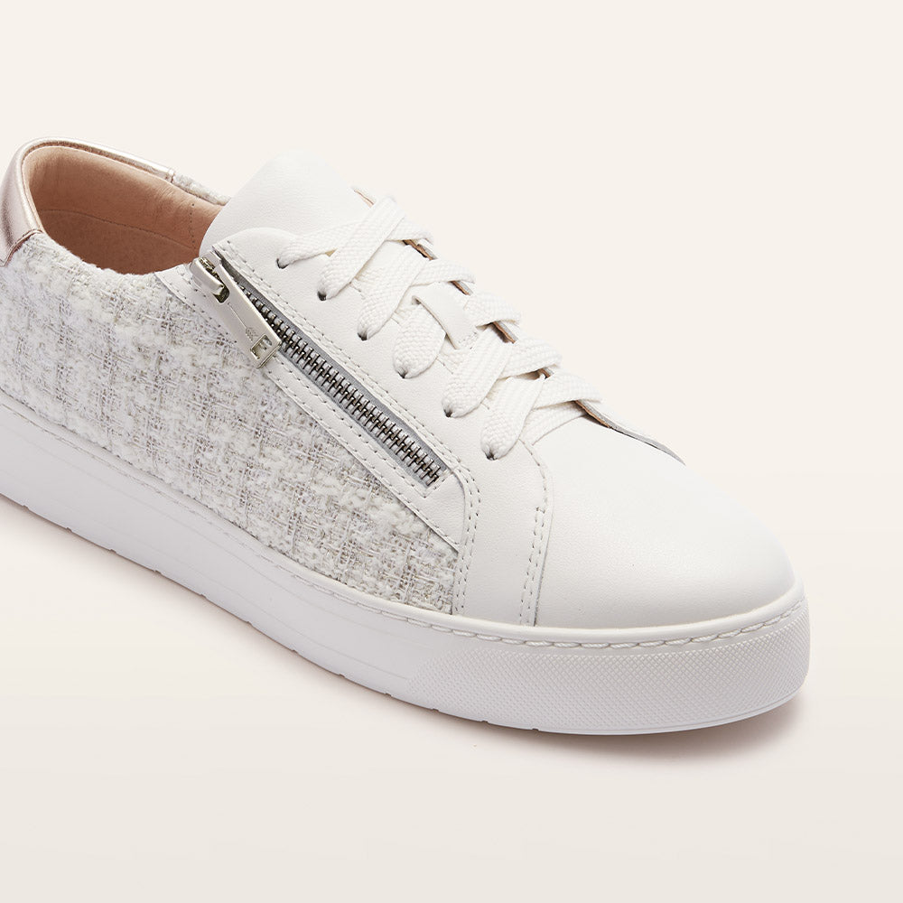 Put a twist on tradition and your sneaker collection with Billie in elegant Soft White Tweed. Billie’s sleek leather silhouette features a side zip for easy wear, expertly placed foam lining, butter-soft leather, and a four-layered cushion and support system. Elevating a mainstay sneaker style with luxe finishes and forward-thinking design, Billie is more than meets the eye.
