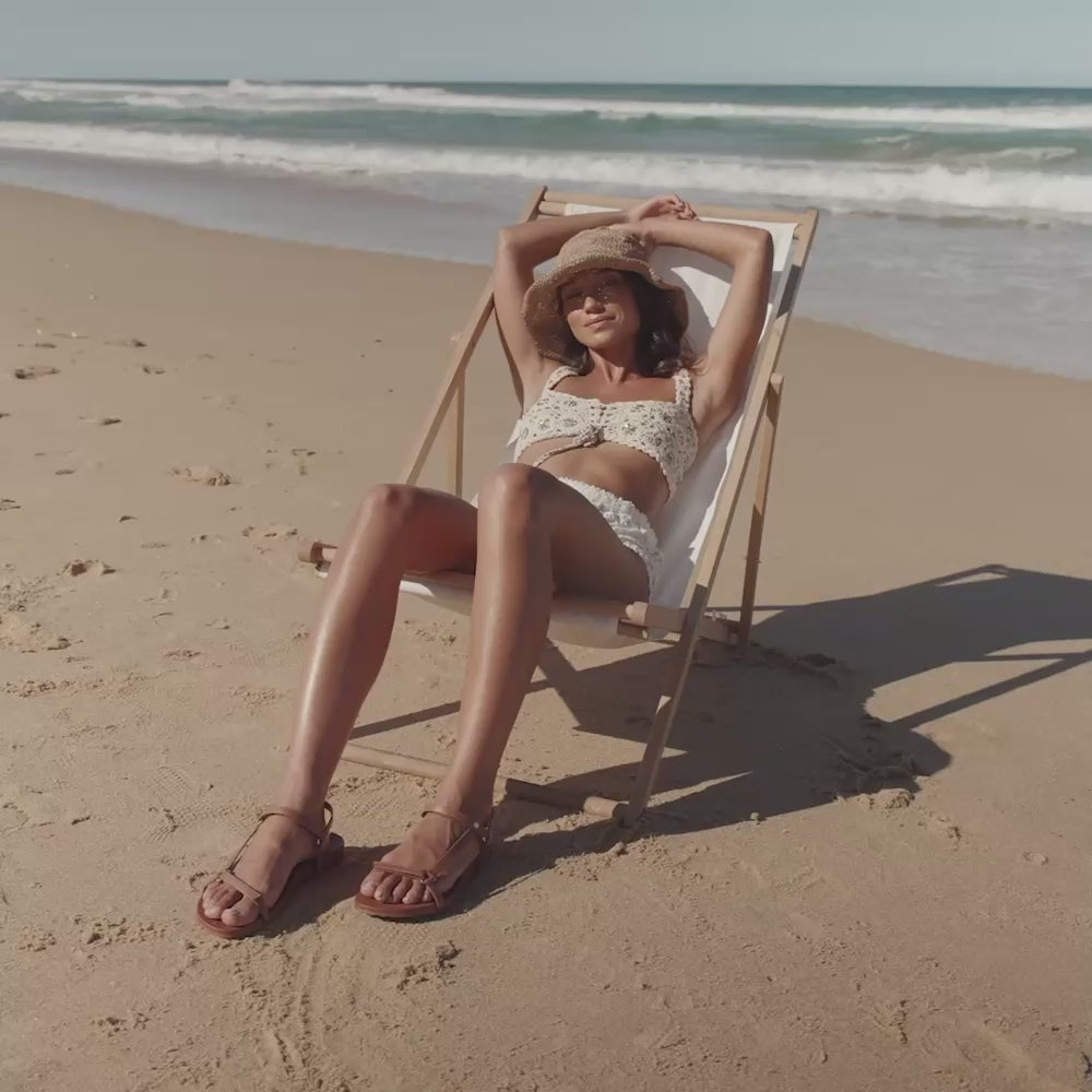 Our beach styles are constructed with waterproofed premium leather uppers and have been road-tested by our development team in pool, camp/bush shower and beach conditions. However leather is a natural product and may experience some colour transfer if it comes into contact with external chemicals, so we recommend allowing applications of sunscreen and insect repellent to dry on bare feet before putting shoes back on.