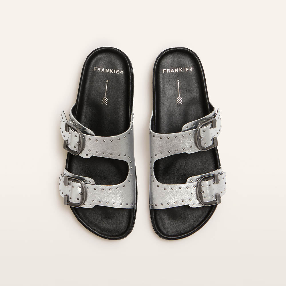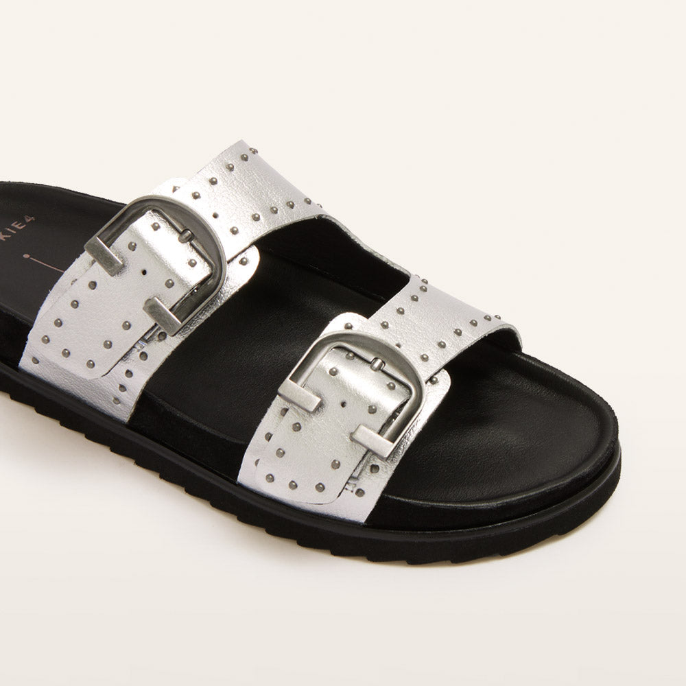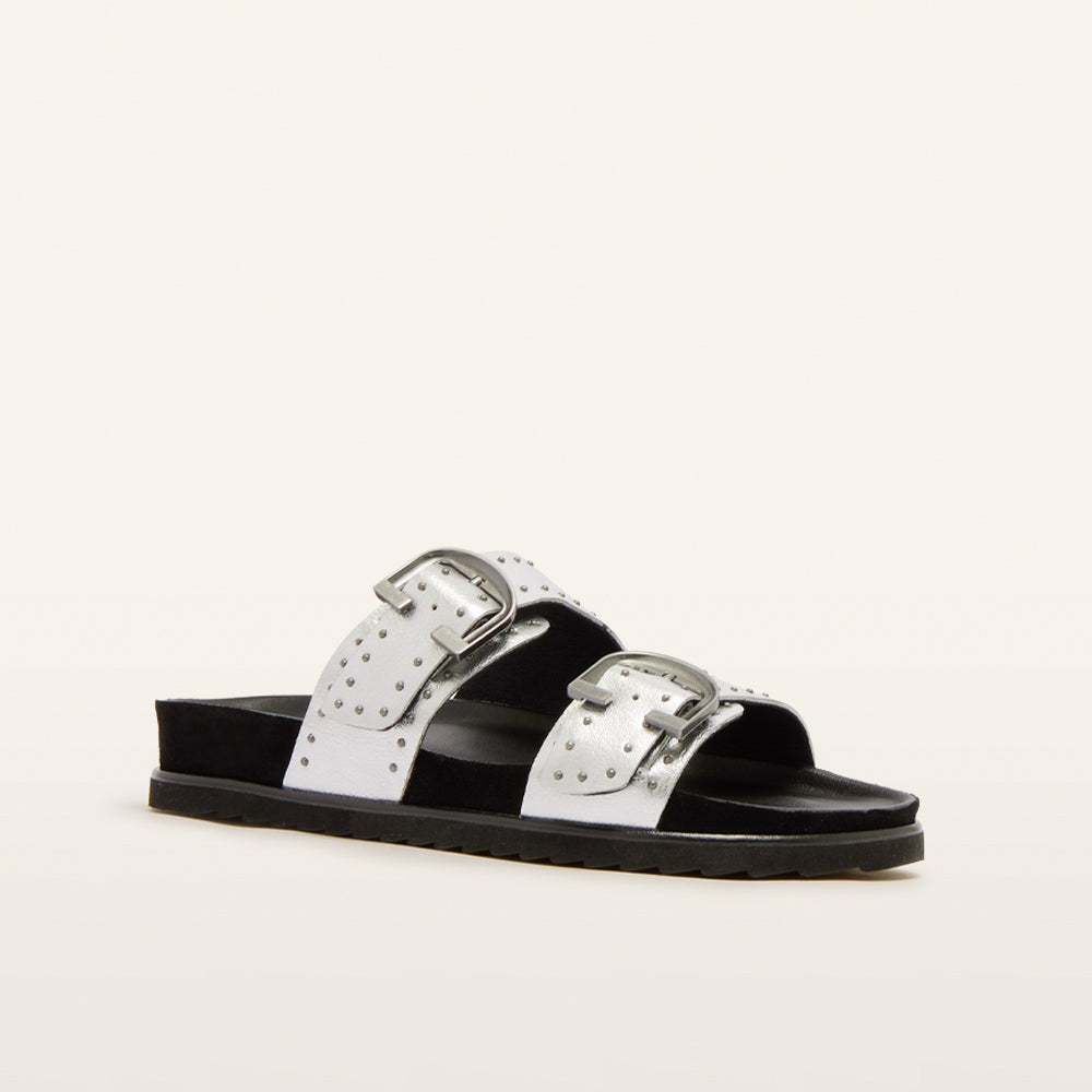 Slide into comfort and style with Deon—the statement slides that make a bold impression in striking Silver Stud. Featuring adjustable straps and eye-catching stud detailing, Deon isn't just about looks—it’s built for comfort too. With our Sole Hero® Footbed, you get support for your heel, arch, and forefoot, while the dual-layer cushion system helps keep foot pain at bay. Crafted from premium leather with a chunky sawtooth sole, Deon is designed for effortless, all-day wear.