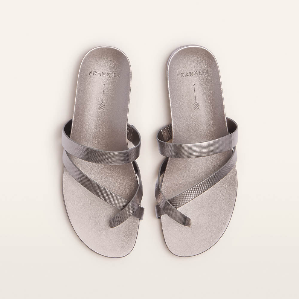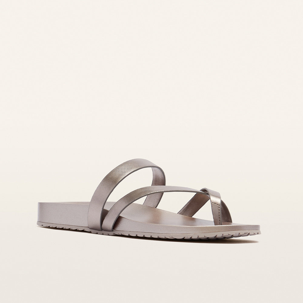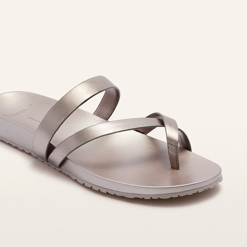 Isla, the sleek beach-proof slide designed to shine in sophisticated Platinum. Crafted with waterproof-treated leather for the upper and lining, making Isla perfect for seaside adventures and pool-to-party styling. The hidden elastic on the instep provides a secure, flexible fit, while the lightweight design ensures a cushioned step.