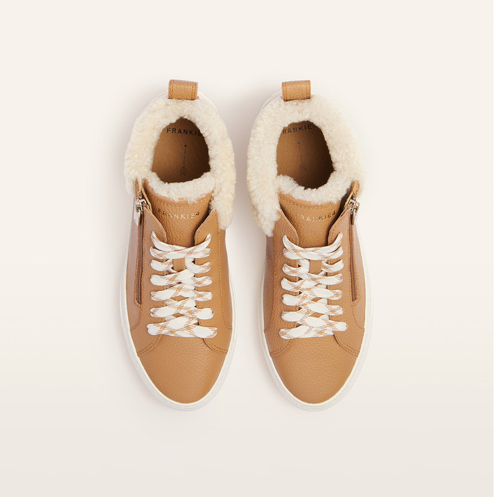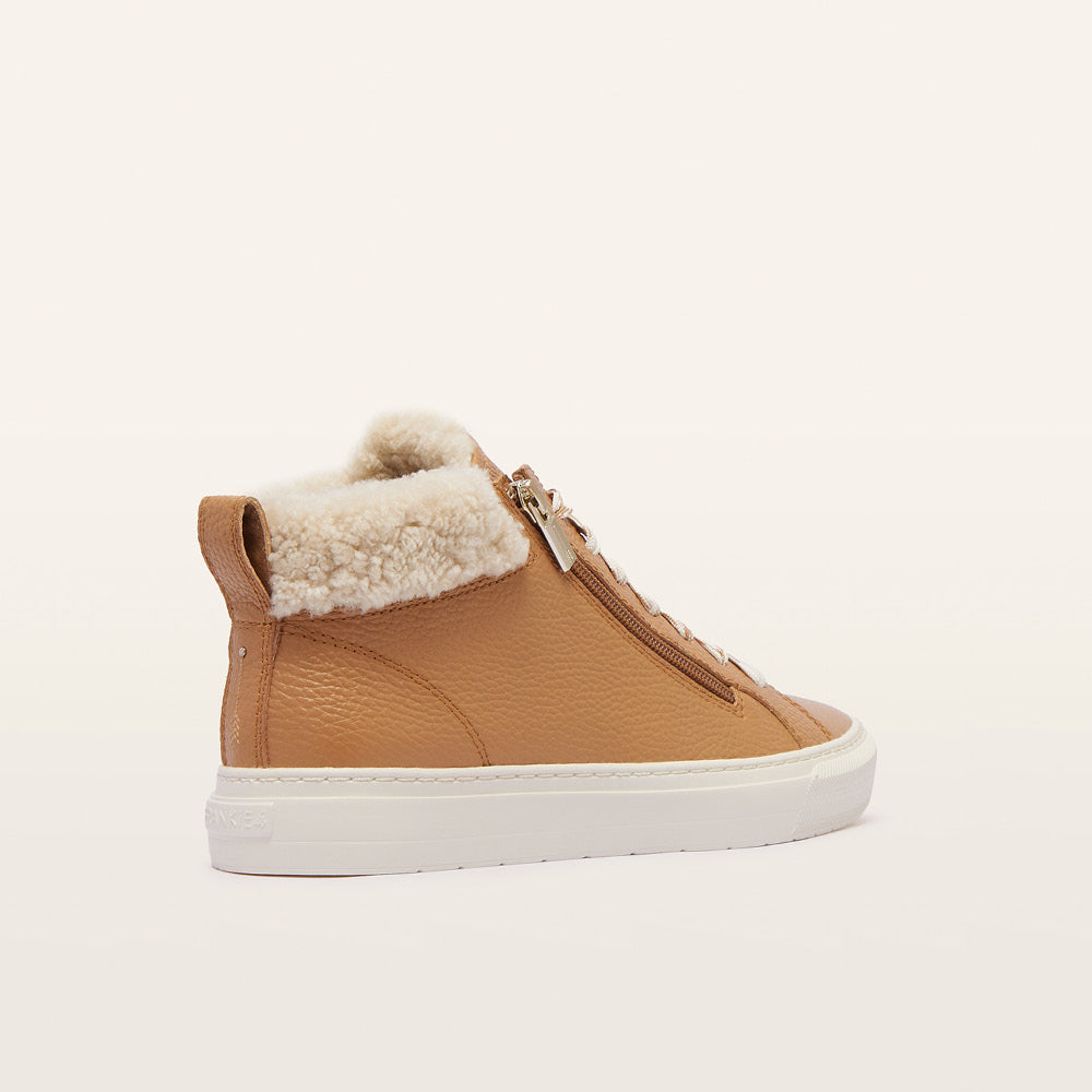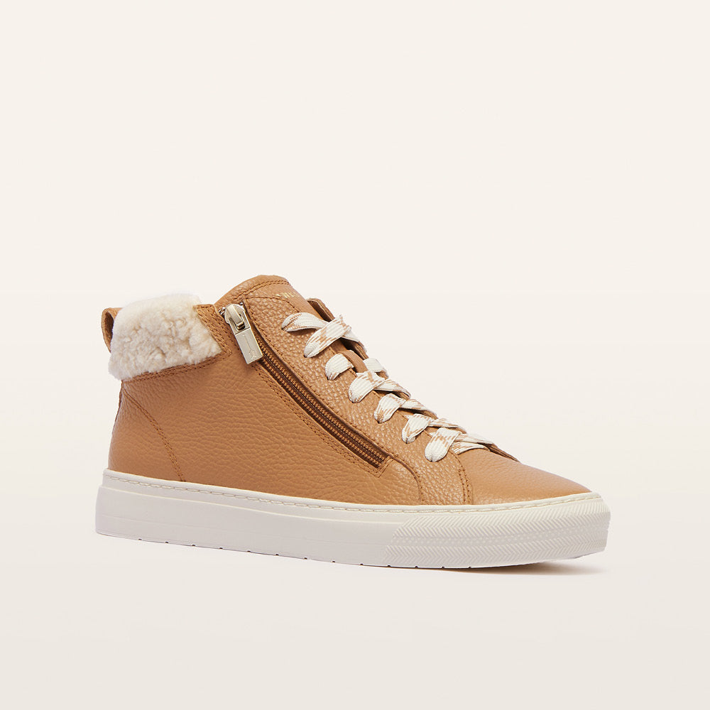 Adding warmth to high-top style, introducing Miles in classic Tan/Shearling. A staple sneaker style with innovative features, Miles features three layers of support and cushioning, a water-resistant leather upper, and a rubber outsole. Complete with shearling from Australian and New Zealand sheep, Miles creates relaxed style that's a little bit luxe. Simply zip Miles on and off for effortless comfort, no undoing laces required. Additional laces also provided for alternative styling.