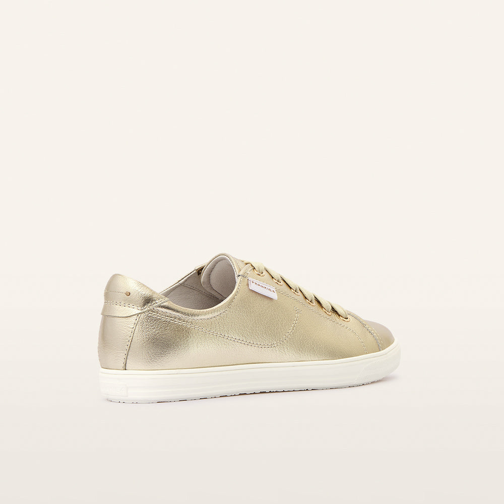 Our number one sneaker—introducing Nat, new generation, in eye-catching Gold Tumbled. Featuring an innovative support and cushion system and luxe leather details, Nat lends signature style and elevated comfort to each step and every look. For a custom approach to styling, this best-selling pair has an elastic gusset that enables them to be worn with or without laces.