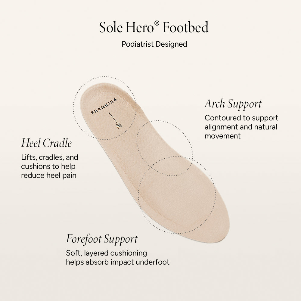 Designed in Australia, every pair of FRANKIE4s features podiatrist-designed support that never compromises on style. Our innovative footbeds are engineered for comfort—whether it’s the Sole Hero® Footbed, which cushions and supports your heel, arch, and forefoot, or the lightweight Luxalite® Footbed, designed to contour to your foot while absorbing shock. Most enclosed styles also include our Sole Saver Pack® to help you customize your fit. Think all-day comfort, made to move with you.