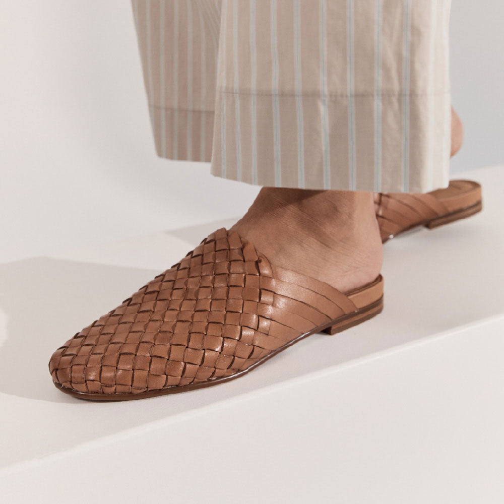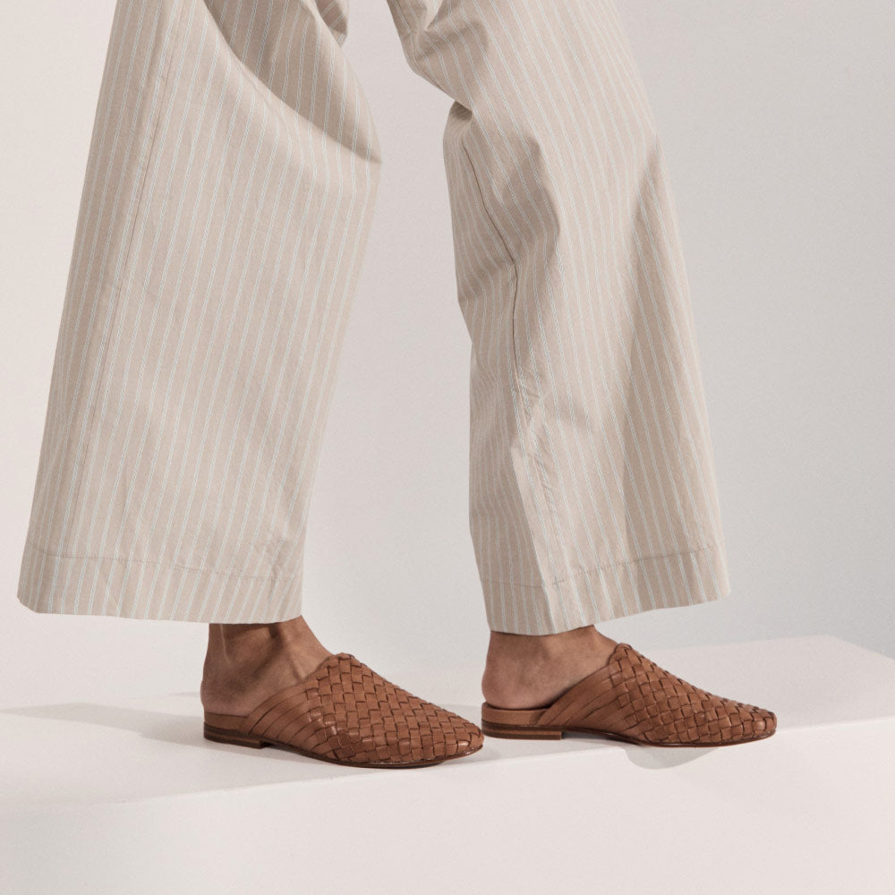 A classic that stands out from the crowd—Wallace classic woven flats provides a unique take on a timeless style in essential Tan Weave. Presented with a hand-woven upper, these beige flats designed for a revolutionary hold, and finished with luxe leather. A triple-layer support and cushion system ensures a cushioned step, while a rounded toe offers an elegant silhouette. Gel forefoot cushions are included for added comfort.